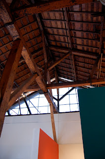 The building itself is amazing -- huge old wooden beams provide for a cathedral-like feeling atop all of the art. It struck me as so cool that such an old and historical place would house such contemporary art. I do love a ceiling with wooden beams...